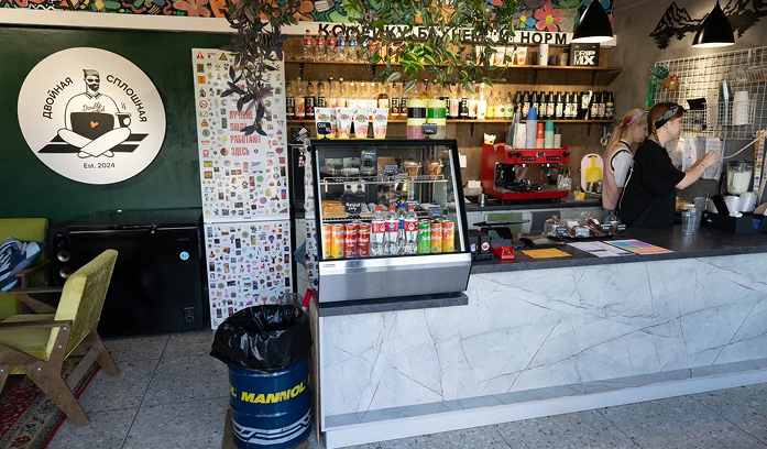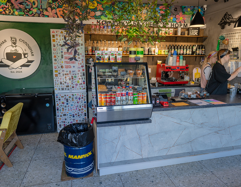 Кофейня «Двойная сплошная» в Горсаду — это место не только для того, чтобы перехватить кофе с печеньем и побежать дальше. Это эпицентр творческой жизни Глазова, созданный Алексеем Золотовым и его женой-кондитером Анной. Они тоже из тех, кто, пожив в Москве и Сочи, осознанно вернулся в родной город. Алексей — человек деятельный и любопытный. Эту энергию он вложил в создание многофункционального и разношёрстного пространства, вдохновляясь стильными и дружелюбными спотами Surf Coffee и сетью спешелти-коффен White Night из Дагестана. Интерьер получился эклектичным и живым: кресла и стулья разных форм и расцветок, стены, расписанные местными граффити-художниками, стопка настолок на полках. Об удаленщиках здесь тоже позаботились: в кофейне открытый Wi-Fi, возле окна – длинная стойка с розетками, рядом – сканер и принтер.