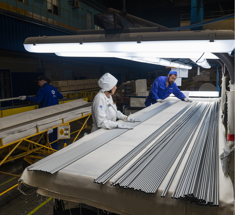Затем — прокатный стан, где заготовку вытягивают и уменьшают в сечении. Далее её режут на части и отправляют в цех по производству мелкого проката. Там из нее получается тончайшая труба, которую после химической обработки, шлифовки и строжайшего контроля упакуют в ярко-желтые ящики и отправят на предприятия, производящие ядерное топливо.